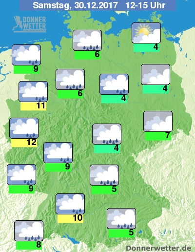 Heute Nachmittag ist allenfalls an der Ostsee regional Sonnenschein möglich, sonst bleibt es bei weigehend dichten Wolken und mit Ausnahme der östlichen Landesteile fällt zeitweise, teils auch kräftiger und langanhaltender Regen. Die Temperatur liegt bei 4 Grad an der Müritz und bis 12 Grad im Rheinland. An der Nordsee weht ein teils stürmischer Wind.