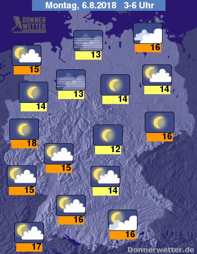 In der folgenden Nacht ziehen über den Süden oft einige, teils auch dichte Wolken. Im übrigen Land ist der Himmel hingegen meist sternenklar und sonst nur locker bewölkt. Es bleibt überall trocken bei Tiefstwerten von 18 Grad in Köln und um 12 Grad im Vogtland.