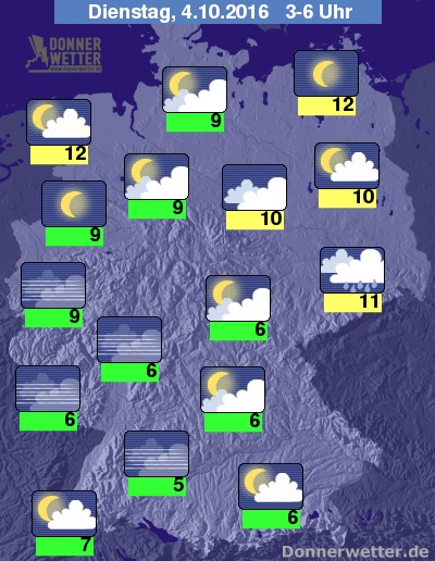 In der Nacht zum Dienstag bleibt es über Ostdeutschland meist stark bewölkt und über Sachsen fällt auch häufig Regen. Vom Süden bis in den Westen und weiter bis in den Nordwesten der Republik zeigt sich ein meist sternenklarer Nachthimmel, dazu bleibt es trocken. Stellenweise kann sich Nebel oder Hochnebel bilden. Die Temperatur sinkt auf 12 Grad in Ostfriesland und bis 5 Grad in Stuttgart.