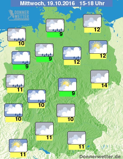Am Nachmittag und frühen Abend ändert sich an dem Wetterbild nur wenig. Im  Westen und entlang der Weser regnet es teils stark und die Sonne schafft es nur selten durch die Wolkendecke. Im restlichen Land ist es überwiegend bedeckt. In Brandenburg und Thüringen zeigt sich öfter mal die Sonne.