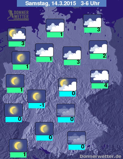 In der folgenden Nacht ist der Himmel im Süden und Westen größtenteils sternenklar oder nur locker bewölkt, nur stellenweise bildet sich Nebel. In der Nordosthälfte des Landes bleiben die Wolken dagegen weitgehend dicht und hier und da kann auch etwas Regen oder Sprühregen fallen. Die Temperatur sinkt auf 4 Grad in Dresden und bis -1 Grad am Odenwald.