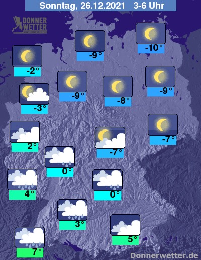 In der Nacht zum Sonntag bleibt es über der Südhälfte der Republik weitgehend bedeckt und vor allem über Baden-Württemberg und Bayern fällt zeitweise Regen. Über der Nordhälfte des Landes ist der Himmel verbreitet sternenklar, dazu bleibt es trocken. Die Temperatur sinkt auf 7 Grad in Freiburg und bis -10 Grad in Neubrandenburg.