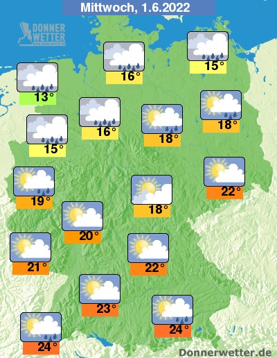 Am Mittwoch zeigt sich der Himmel in Küstennähe sowie im äußersten Nordwesten bedeckt und zeitweise muss mit Schauern und kurzen Gewittern gerechnet werden. Im Süden nimmt die Bewölkung im Tagesverlauf zu, einzelne Schauer greifen dann auf das Alpenvorland über. In den übrigen Landesteilen dominiert am Mittwoch ein trockener Mix aus Sonne und lockeren Wolken.