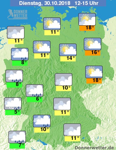 Am frühen Nachmittag fällt im Westen und Südwesten zeitweise Regen. Im Staubereich der westdeutschen Mittelgebirge fällt der Regen intensiver aus. Zum Teil mischen sich auf den Höhen auch Schneeflocken unter die Tropfen. Die Temperaturen liegen hier bei nass-kalten 5 bis 10 Grad. Außerdem frischt der Südwestwind spürbar auf und es drohen örtlich auch Sturmböen. Nach Norden und Nordosten hin gibt es größere Wolkenlücken und die Sonne lässt sich gelegentlich blicken. Ganz im Nordosten kann sich die Luft auf 15 bis 18 Grad erwärmen.