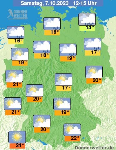 Heute Nachmittag zeigt sich das Wetter über der Südwesthälfte verbreitet heiter oder sonnig, dabei bleibt es trocken. Im Norden, aber auch im Osten halten sich meist dichte Wolken, dazu fällt gebietsweise Regen. Die Temperatur lieg bei kühlen 14 Grad an der Müritz und etwa 24 Grad am Oberrhein.