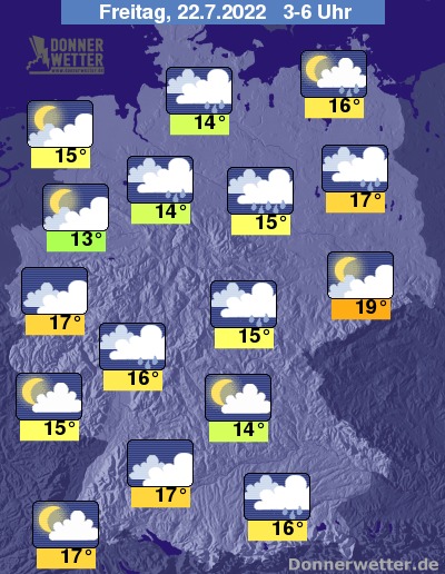 In der folgenden Nacht lockert es vor allem im Süden häufig auf, hier bleibt es zum Großteil trocken. Sonst zieht hingegen oft dichte Bewölkung durch und es bilden sich gebietsweise Schauer, jedoch nur noch selten Gewitter. Die Temperatur sinkt auf 19 Grad in Dresden und etwa 13 Grad in Meppen.