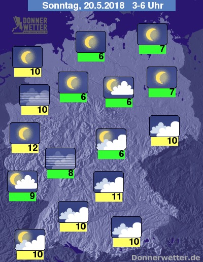 In der Nacht zum Sonntag funkeln über dem Norden und Westen die Sterne von einem weitgehend sternenklaren Himmel. Meist dicht bleibt die Wolkendecke jedoch über dem Süden und in der ersten Nachthälfte auch über Sachsen, dabei bleibt es zumindest schon meist trocken. Die Temperatur sinkt auf 12 Grad in der Kölner Bucht und bis 6 Grad in der Norddeutschen Tiefebene.