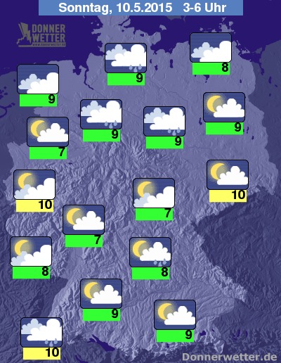 In der kommenden Nacht ziehen im Norden überwiegend dichte Wolken durch und es fällt dabei zeitweise Regen, sonst ist es aufgelockert oder stark bewölkt und im Süden sind gebietsweise Schauer möglich, im übrigen Bundesgebiet bleibt es weitgehend trocken. Die Temperatur sinkt auf 10 Grad in Dresden und bis 7 Grad am Westerwald.