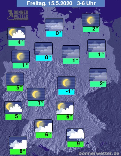 Bis zu den Frühstunden kühlt die Luft im Norden und Osten auf -1 bis 4 Grad ab. Es muss also verbreitet mit Bodenfrösten und örtlich auch mit Frost in 2 Meter Höhe gerechnet werden. Im Süden und Südwesten bleibt es mit 4 bis 9 Grad milder.