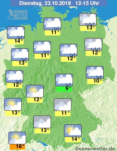 Am frühen Nachmittag fällt in der Nordhälfte und im Osten aus kompakten Schichtwolken zeitweise Regen und Sprühregen, Richtung Brandenburg und Mecklenburg-Vorpommern auch mal kräftiger. Im Süden und Südwesten gibt es eine meist trockene Mischung aus Sonne und Wolken. Die Temperaturen bewegen sich allgemein zwischen 9 und 14 Grad, mit sonniger Unterstützung können im Breisgau aber auch 15 Grad überschritten werden.