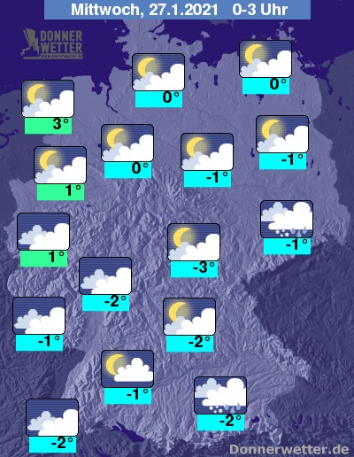 Während der zweiten Nachthälfte fällt über den Mittelgebirgen und Teilen Bayerns noch gelegentlich Schnee oder Schneeregen mit erhöhter Rutschgefahr. Sonst wechseln sich dichtere Wolken mit Aufklarungsphasen ab. Im Norden fällt regional etwas Schnee oder Regen.