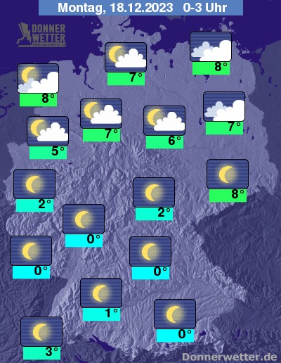 In der Nacht auf Montag bleibt der Himmel über der Nordhälfte stark bewölkt oder es ist bedeckt, zeitweise kann leichter Regen fallen. Weiter südlich ist es häufig sternenklar oder nur gering bewölkt, verbreitet kann sich Nebel oder Hochnebel bilden.