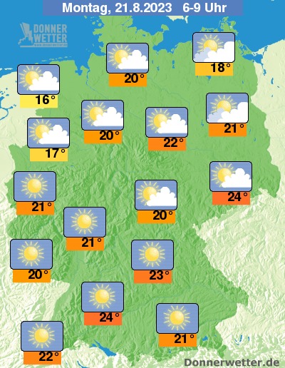 Die Temperaturen liegen in den Frühstunden bei Werten um 16 Grad an der Nordseeküste und 24 Grad in der Lausitz.