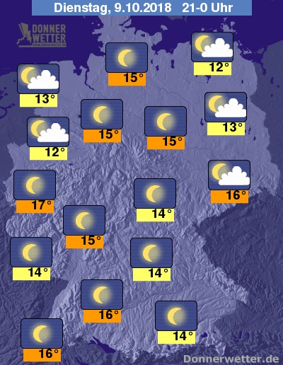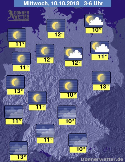 Während der zweiten Nachthälfe verschleiern nur im Nordosten einige Wolken den Himmel. Sonst funkeln verbreitet die Sterne. Im weiteren Verlauf bilden sich vor allem in der Südhälfte vermehrt Nebelfelder, die sich teilweise bis in den Vormittag zäh halten können. Mit allgemein Werten von 10 bis 13 Grad bleibt die Nacht für Oktober deutlich zu mild. Kühler wird es nur in Tälern und Senken, sowie außerhalb von Ortschaften.