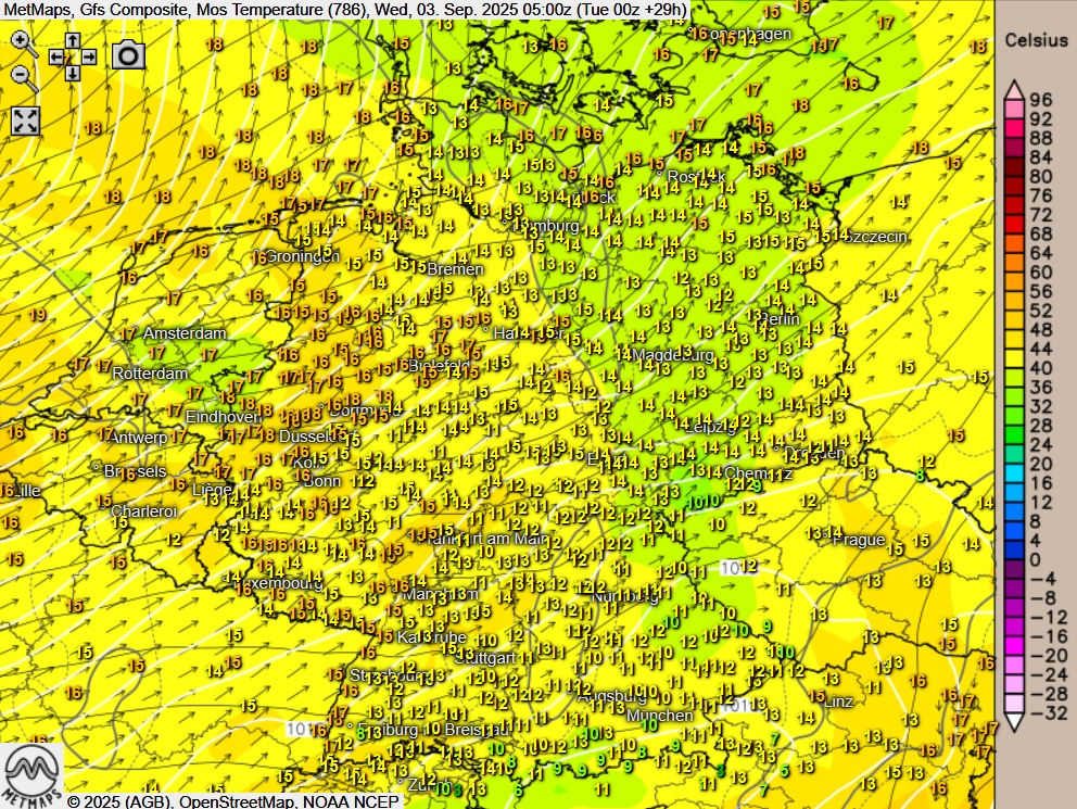 Die Strömungs- und Temperaturkarte für Mittwochmorgen (05:00 Uhr) nach GFS: