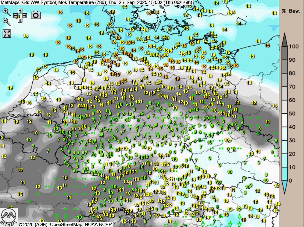 Die Wetter- und Temperaturkarte für Donnerstagnachmittag (15:00 Uhr) sowie die Sechs-Stunden-Regenmengen bis Donnerstagabend (21:00 Uhr) nach GFS: