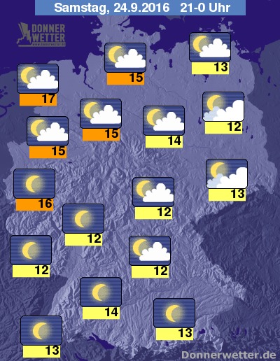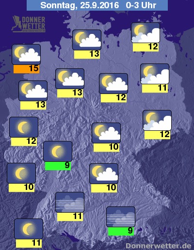 Die Temperaturen fallen im Nachtverlauf auf Tiefstwerte um 15 Grad C im äußersten Nordwesten und um 9 Grad C im Taunus.