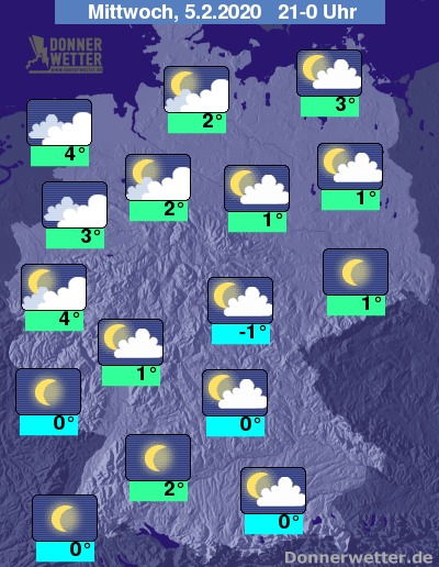 Bis zu den Frühstunden kühlt die Luft in der Nordhälfte auf 0 bis 4 Grad ab, in der Südhälfte gibt es teilweise Frost mit Werten knapp unterhalb des Gefrierpunktes. Südlich der Donau wird es noch kälter.