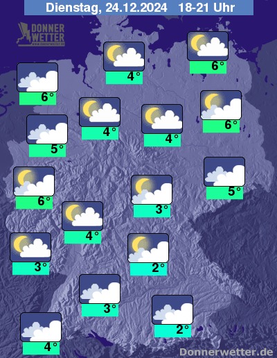 Am heutigen Heiligabend zeigt sich der Himmel oft stark, hin und wieder aber auch aufgelockert bewölkt. In Nordseenähe ist etwas Regen möglich, während es im übrigen Bundesgebiet trocken bleibt. Die Temperatur liegt bei 2 Grad in München und etwa 6 Grad in Köln.