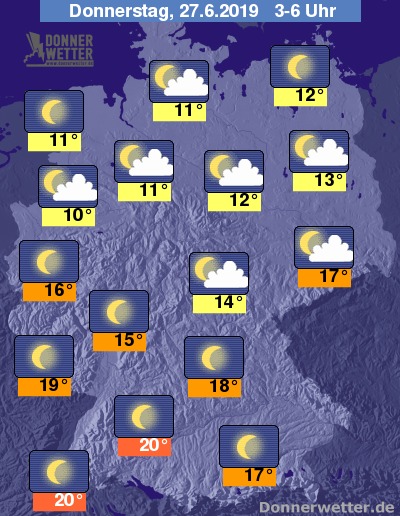 Bis zu den Frühstunden bleiben die Temperaturen in der Südhälfte bei lauen 15 bis 20 Grad. In der Nordhälfte kann man bei erfrischenden 10 bis 15 Grad endlich mal wieder tüchtig durchlüften.
