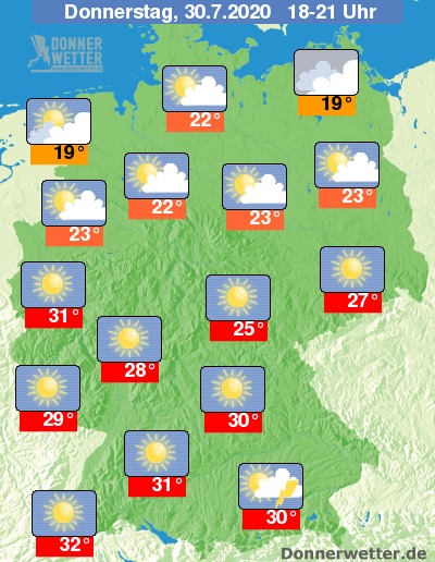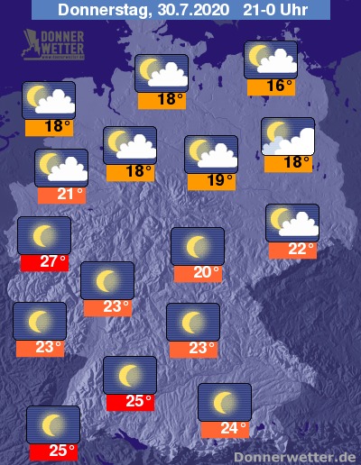 Die Temperaturen liegen am Abend bei zunächst noch 19 Grad an den Küsten und 32 Grad im Breisgau. Am späteren Abend sinken die Werte dann auf 27 bis 16 Grad ab.