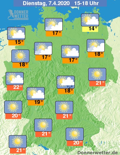 Die Temperaturen bewegen sich im Norden und über der Mitte meist zwischen 14 und 20 Grad, am kühlsten bleibt es an den Küsten von Nord- und Ostsee. Im Süden und Westen, sowie in Teilen von Sachsen wird die 20 Grad - Marke überschritten.