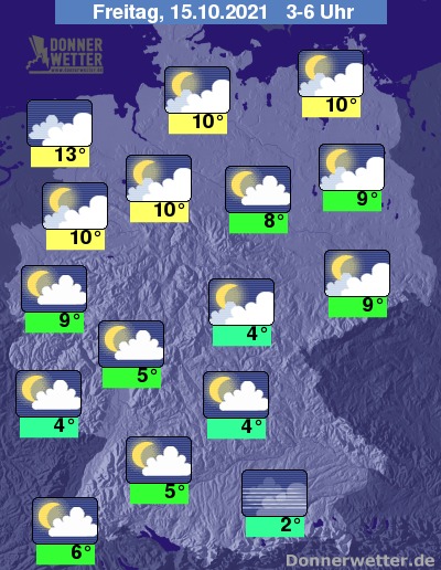 In der Nacht zum Freitag ist es über dem Süden meist locker bewölkt, teils auch sternenklar. Über dem übrigen Bundesgebiet ist es aufgelockert oder stark bewölkt. Es bleibt landesweit trocken bei Tiefstwerten von 13 Grad an der Nordsee und bis 2 Grad im Berchtesgadener Land.