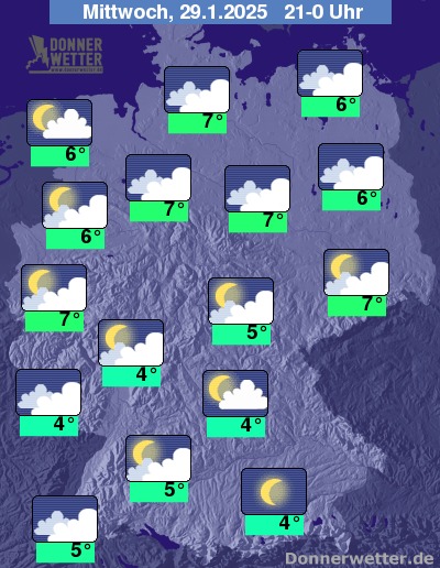 In der Nacht zum Donnerstag zieht der Regen im Nordosten ab. In den übrigen Landesteilen bleibt es bei wechselnder bis aufgelockerter Bewölkung zunächst niederschlagsfrei. Im Nachtverlauf verdichten sich die Wolken im Westen dann und es fällt zeitweise etwas Regen.