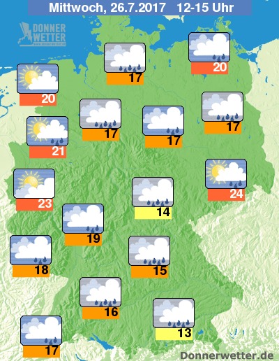 Heute Nachmittag ist es im westlichen Niedersachsen und der Westhälfte von NRW locker bis wechselnd bewölkt und dazu überwiegend trocken. Im übrigen Bundesgebiet halten sich hingegen zumeist dichte Wolken und es fällt zeitweise Regen. Die Temperatur liegt bei teils nur 13 Grad in Augsburg und bis 24 Grad im Rheinland.