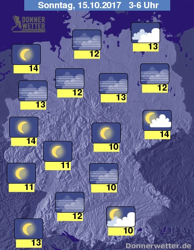 In der Nacht zum Sonntag funkeln über der Republik meist ungestört die Sterne. Im Umfeld der Ostsee können sich teils dichte Wolken halten. Stellenweise bilden sich Nebel oder Hochnebel, dazu bleibt es trocken. Die Temperatur sinkt auf 14 Grad im Rheinland und bis etwa 10 Grad im Grabfeld.
