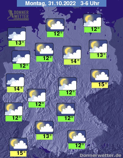 In der Nacht zum Montag zeigt sich der Himmel über der Republik häufig locker, gebietsweise jedoch auch stark bewölkt. Es bleibt überall trocken bei 15 Grad in Freiburg und 12 Grad in Hamburg.