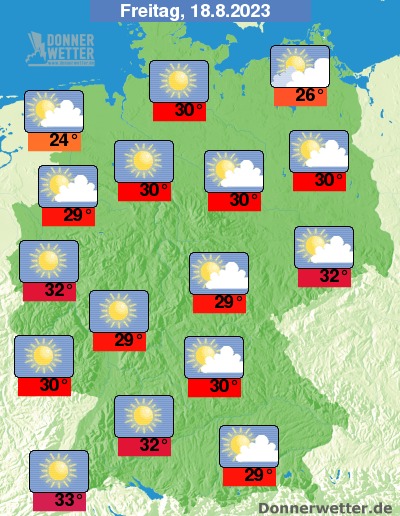 Die Temperaturen erreichen in der Spitze Werte um 24 bis 26 Grad an den Küsten, um 30 Grad an der Spree und 33 Grad am Hochrhein.