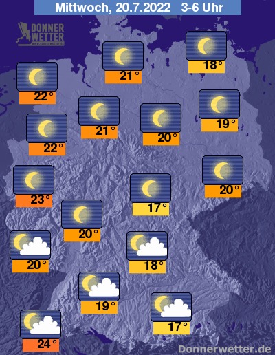 In der Nacht zum Mittwoch zieht im Süden gebietsweise lockere bis aufgelockerte Bewölkung durch, im übrigen Land bleibt es dagegen weitgehend sternenklar. Die Temperatur sinkt auf tropische 24 Grad in Freiburg und etwas kühlere 17 Grad in Jena, dabei bleibt es trocken.