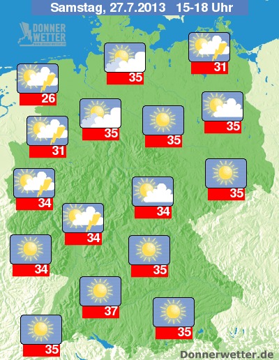 Am Sonntag wird der Höhepunkt der Hitzewelle im Osten erreicht, die höchsten Temperaturen werden dann wohl mit über 38 Grad, vielleicht auch 40 Grad in Brandenburg und Sachsen gemessen werden. Im Westen kommt etwas kühlere Luft an, so dass es starke Schauer und Gewitter gibt, die teilweise auch unwetterartig ausfallen können. Genauere Vorhersagen werden dann im Laufe des Wochenendes möglich sein.