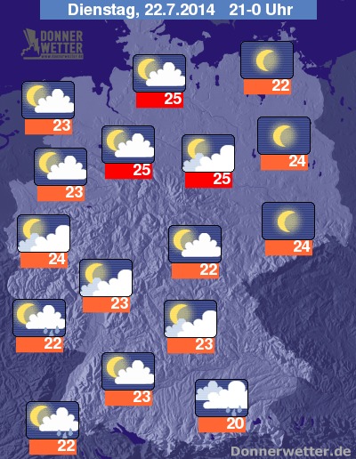 Heute Abend ist es überwiegend locker oder aufgelockert bewölkt und trocken. Im Süden bleibt es dagegen meist stark bewölkt und es bilden sich vor allem am Alpenrand noch einige Schauer, und gebietsweise auch Gewitter. Die Abendtemperaturen liegen bei 25 Grad in Hamburg und 20 Grad im Allgäu.