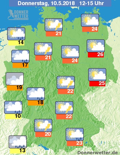 Hoch "Quinlan" zieht nun endgültig nach Osten ab und dahinter zieht das Regenband eines Island-Tiefs über Mitteleuropa hinweg. Dieses bringt teils kräftige Schauer und Gewitter mit sich, die im Tagesverlauf ostwärts über Deutschland hinwegziehen. Nach Abzug der Schauer und Gewitter ist der Himmel weiterhin meist dicht bewölkt und vereinzelt regnet es noch leicht. Im Nordosten des Landes bleibt es hingegen zunächst noch recht sonnig, bevor sich gegen Abend auch hier vermehrt Quellwolken bilden.