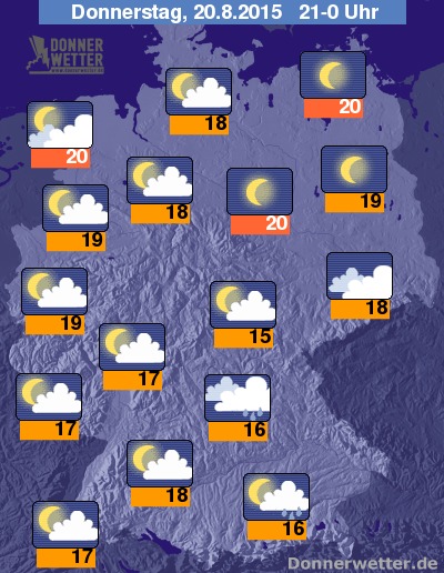 Die späten Abendstunden zeigen ein ruhiges Wetter an. In den Gebieten Oberbayern und Mittelfranken sind mit leichten Schauern zu rechnen. Im Nordosten wirds ein klaren Sternhimmel geben. Im Westen und im Norden der Republik hält das Wetter sich konstant heiter. Die Temperaturen haben Werte von 20 Grad C bis hin auf 15 Grad C.