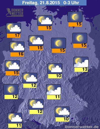 In den weiteren Nachtstunden hält sich das Wetter konstant. In den Regionen Baden-Württemebrg und Bayerns siehts nach einer kühlen Nacht aus. Im Mittelfranken hat die Wetterlage sich beruhigt. In Oberbayern sind immernoch Schauer angesagt. Die Temperaturen sinken von 17 Grad C bis auf kühle 10 Grad C.