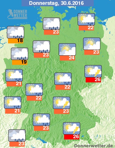 Wärmer und freundlicher kommen zwar die anderen Landesteile davon, Schauer und vereinzelte Gewitter müssen aber auch hier verbreitet eingeplant werden. Die Temperaturen erreichen dabei Werte um 21 bis 24 Grad C, in Sachsen und dem Berchtesgadener Land steigt das Thermometer sogar auf schwül-warme 26 Grad C.