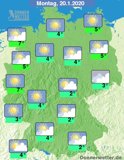 Die neue Woche startet vor allem im Norden und Westen Deutschlands mit viel Sonnenschein. Im Süden und Osten zeigt sich der Himmel im Tagesverlauf überwiegend aufgelockert bewölkt, an der oberen Elbe auch teils bedeckt. Schauer sind am Montag nicht zu erwarten. Die Temperaturen erreichen Werte um 2 bis 7 Grad.