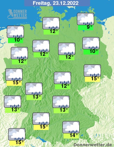 Am Freitag bleibt es weitgehend bedeckt, dabei fällt zum Teil kräftiger und langanhaltender Regen. Die Temperatur erreicht 9 Grad in Rostock und bis 15 Grad in Stuttgart. Über der Südhälfte weht ein starker und oft stürmischer Wind.