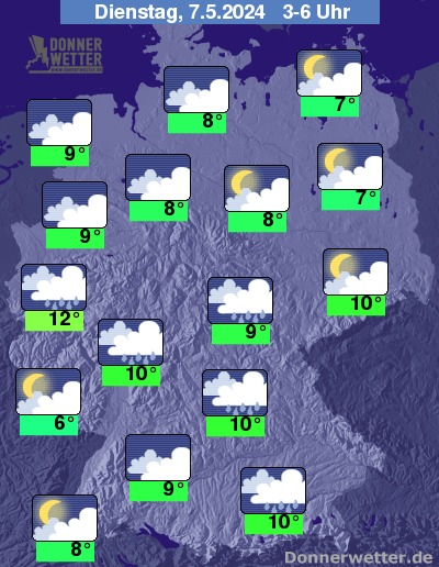 In den südlichen Landesteilen muss bei überwiegend starker Bewölkung mit teils kräftigen Schauern und Gewittern gerechnet werden; vor allem in Bayern können lokal binnen weniger Stunden 50 bis 60 l/m² Regen fallen. Weiterhin muss hier auch mit Sturmböen um bis 90 km/h gerechnet werden.