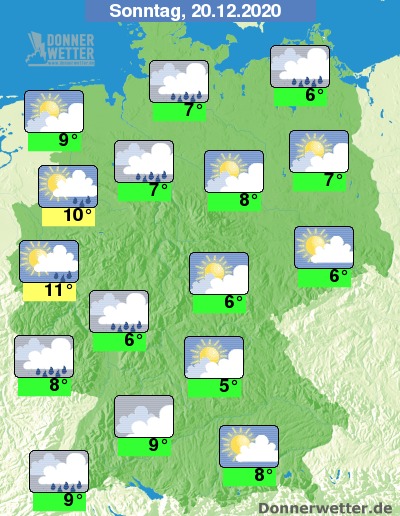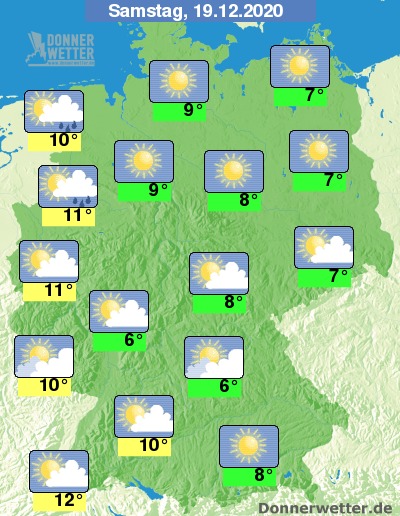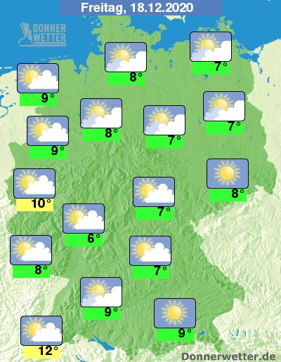 Über den Westen und Norden schwenken kompakte Wolken mit Regen hinweg. Im Osten und Süden überwiegt nach teils zäher Nebelauflösung freundliches Wetter mit einigen größeren Aufheiterungen.