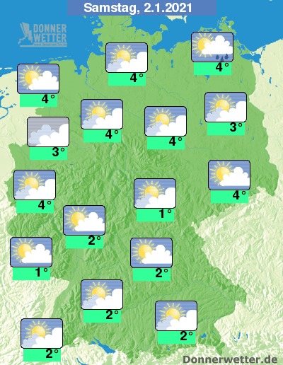 Am Neujahrstag fällt zunächst gebietsweise Regen oder Schneeregen, oberhalb etwa 200 bis 400 Meter meistens Schnee mit Glättegefahr. Im Tagesverlauf werden die Niederschläge seltener. Im Münsterland und an der Ems gibt es kurze freundliche Phasen.