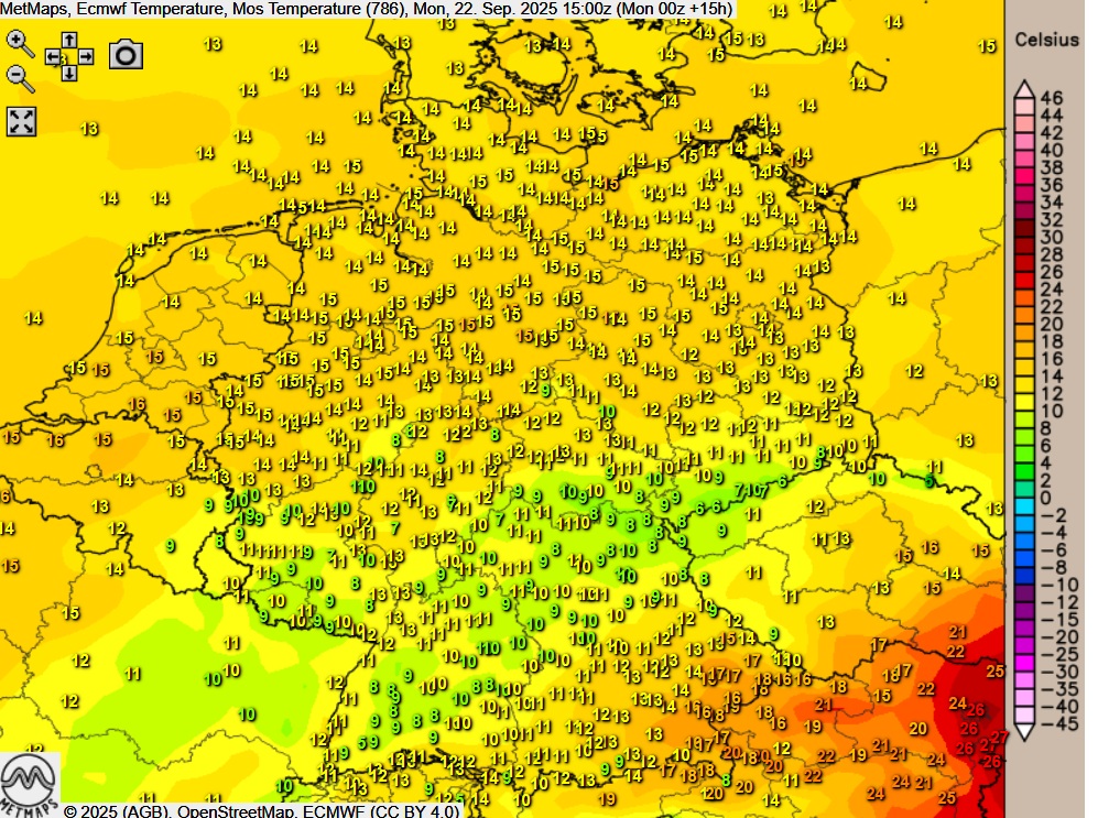 Die Lufttemperaturen am Montagnachmittag (15:00 Uhr) nach ECMWF: