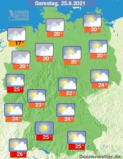 Am Samstag zieht im Norden oft dichte, zum Teils auch aufgelockerte Bewölkung durch. Im übrigen Bundesgebiet ist es vielerorts heiter bis sonnig, hier und da ziehen aber auch einige Wolken durch. Es bleibt landesweit trocken bei Höchstwerten von 17 Grad in Bremerhaven und bis 26 Grad in Freiburg.