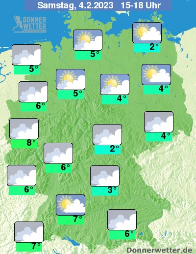 Am Nachmittag ist der Himmel vom Nordosten bis in die Mitte hinein heiter bis wolkig oder aufgelockert bewölkt; in den übrigen Landesteilen bleibt der Himmel stark bewölkt oder es ist bedeckt. Am Alpenrand sind anfangs noch einzelne Schneefälle möglich, sonst bleibt es am Nachmittag und Abend meist trocken.