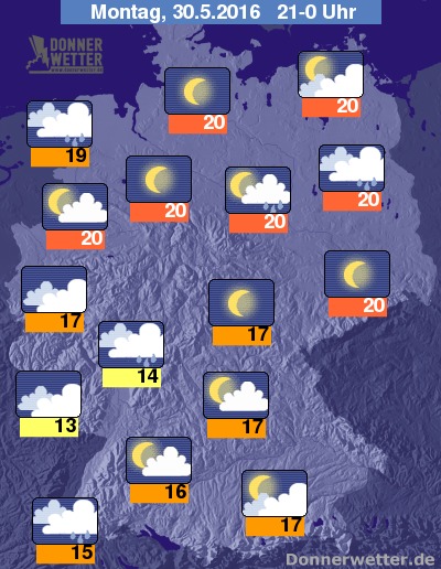 In der Nacht zum Dienstag schauert es im Nordwesten, östlich der Elbe und in Teilen des Südwesten phasenweise, auch einzelne Gewitter können sich bilden. Im übrigen Land ist es teils aufgelockert bewölkt, hier und da auch sternenklar, dabei bleibt es weitgehend trocken. Die Temperatur sinkt auf 20 Grad in Brandenburg und bis etwa 13 Grad an der Mosel.