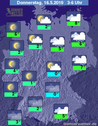 Die Luft kühlt bis zu den Frühstunden auf 5 bis 0 Grad ab, wahrscheinlich gibt es in der Landesmitte auch wieder stellenweise leichten Spätfrost. An der See, sowie unter den dichten Wolken im Nordosten bleibt es etwas milder.