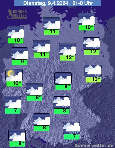 Die Temperaturgegensätze am Nachmittag sind sehr hoch: Am Oberrhein werden nur Werte um 9 Grad erreicht, um 12 Grad im Nordwesten und nochmals sommerlich-warme 25 bis 26 Grad im Osten und Südosten.